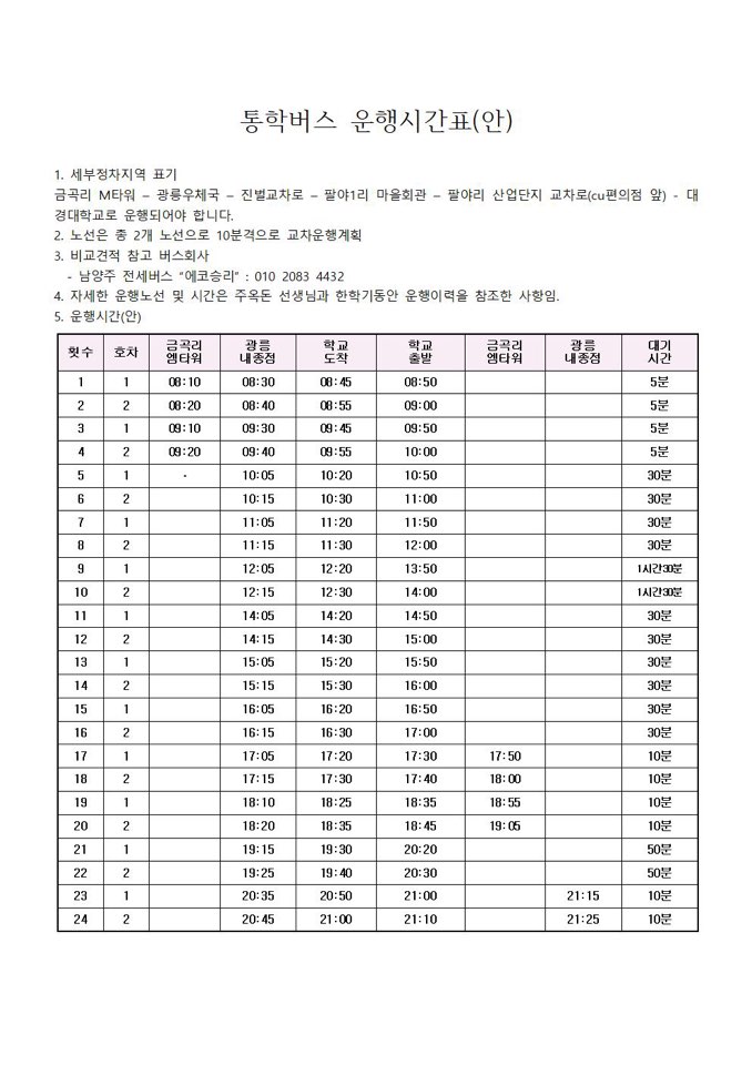 <br/>스쿨버스 노선도 및 시간표 알려주세요